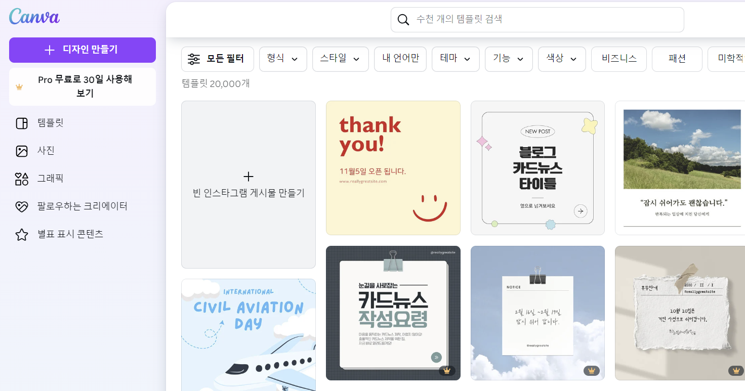 하지만 모든 디자인을 이용하시려면 Pro 구독을 하셔야 한다는 점! 참고하시길 바랍니다.